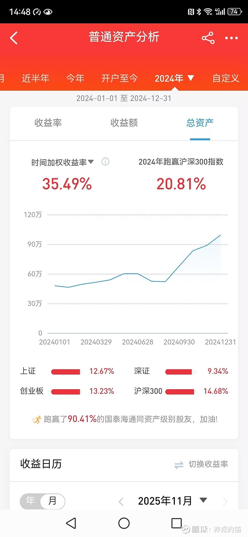 2024年,指数跌到了2600多,18.88清仓了紫金矿业,8.88清仓了中国铝业,第二次建仓了长安汽车。中远海控开始在10块左右逐步加仓。同年11月24日,猫叔来到了雪球,开始寻找志同道合的朋友,分享自己的投资经验。这一年收益率是五年中第二好的一年,35.49%。