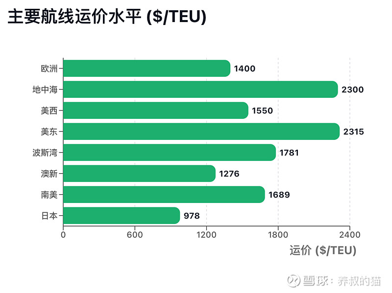 欧线(地中海),上海港出口至欧洲基本港市场运价(海运及海运附加费)为1400美元/TEU,较上期下跌0.3%。上海港出口至地中海基本港市场运价(海运及海运附加费)为2300美元/TEU,较上期上涨3.0%。