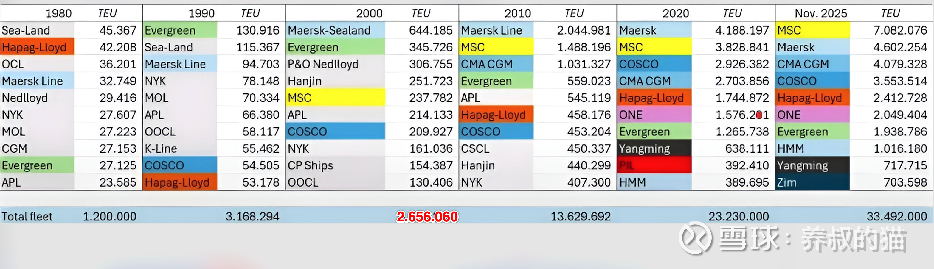 45年了,从1980年到2025年11月,全球集装箱航运业船队总容量从1980年代的120万TEU跃升至3349.2万TEU,增长近28倍,这45年,是全球化贸易汹涌浪潮的45年,也是中国飞速发展的45年,更是80后跌宕起伏的45年。