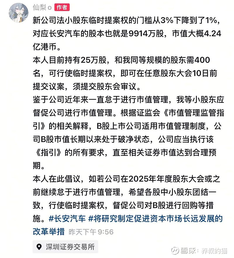 投资者基于公开数据,行使法定权利,目的是改善公司治理,猫叔没有看到有什么恶意或者干扰了长安汽车经营决策的地方,如果这位投资者存在长安汽车(公关团队))所言的“恶意”定性或者干扰决策,还需要给出实证。我们一众长安汽车的中小股东,不会拉偏架,一切以事实为准绳,以法律为依据。