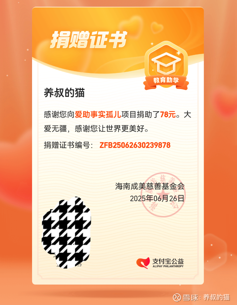 2025年06月26日,第一期捐助65.600元(+20%猫叔自付)给“爱助事实孤儿”项目,合计78元。(见图1)