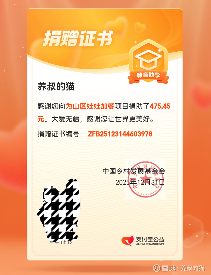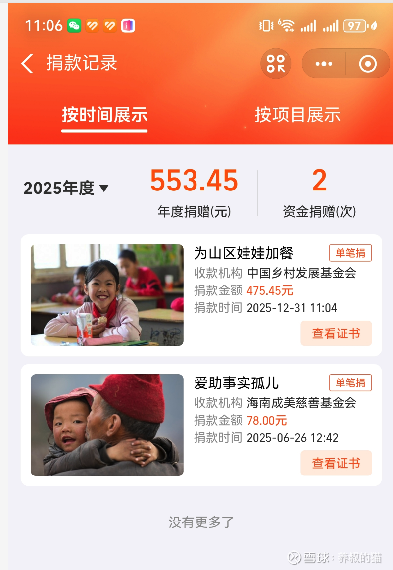 2025年12月31日,第二期捐助396.21元(+20%猫叔自付)给“为山区娃娃加餐”项目,合计475.45元。(见图2)