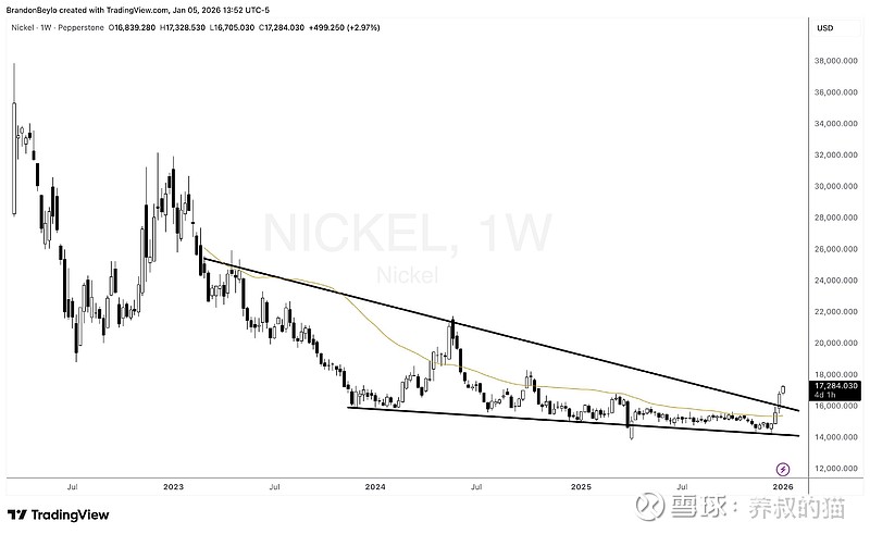 镍价站稳17000美元/吨,站上200周均线,从2022年3月的历史高点(俄乌冲突导致的逼空行情,最高冲到约55,000美元)开始,镍价形成了一个近3年的下降楔形收敛三角,当前位置恰好在楔形末端,楔形末端突破概率大,这是变盘的关键时刻。2024年全年在14,500-17,000美元区间横盘震荡,充分换手,筑底时间够长了,去年有色大牛,大家的目光都聚焦在黄金白银锂上。$上证指数(SH000001)$