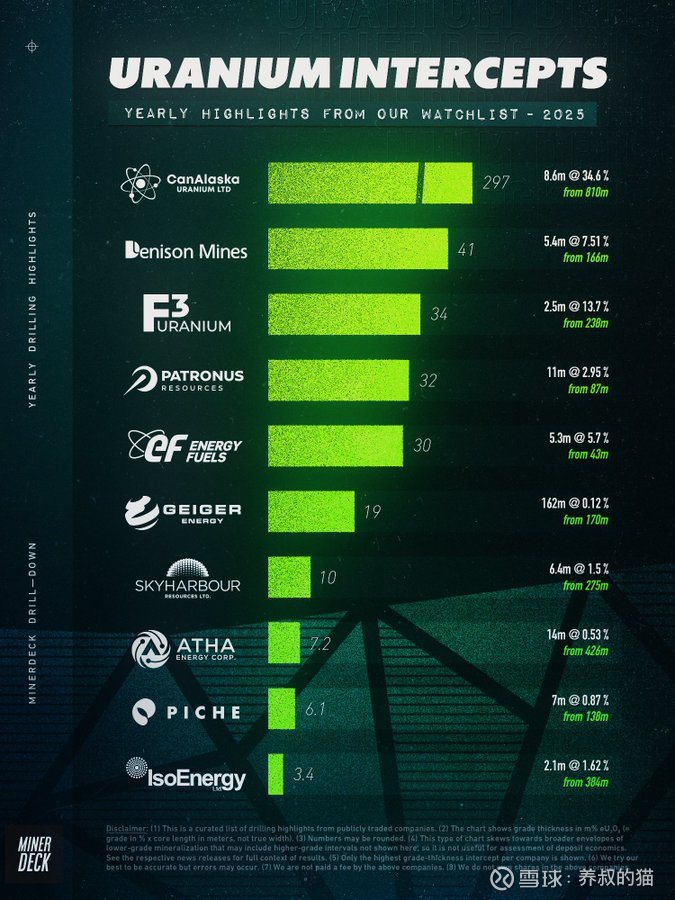 如图所示,2025年全球铀矿钻探前10名中绝大多数项目位于加拿大Athabasca Basin(全球最高品位铀区),CanAlaska、Denison、F3、Skyharbour、Atha、IsoEnergy等均为加拿大公司或核心资产在加拿大。