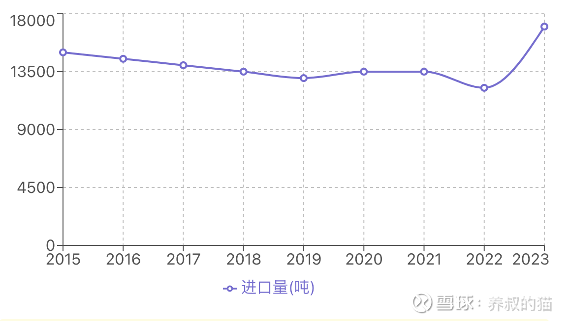 2015-2022年进口量整体呈下降态势,但2023年出现显著回升。