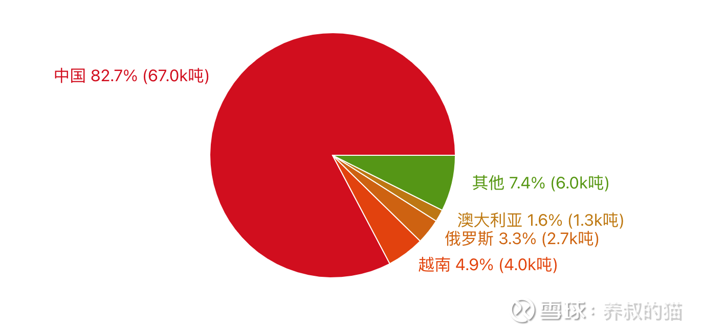 中国占全球产量超过80%,越南5%,俄罗斯3%,澳大利亚2%,其他国家合计不足10%。