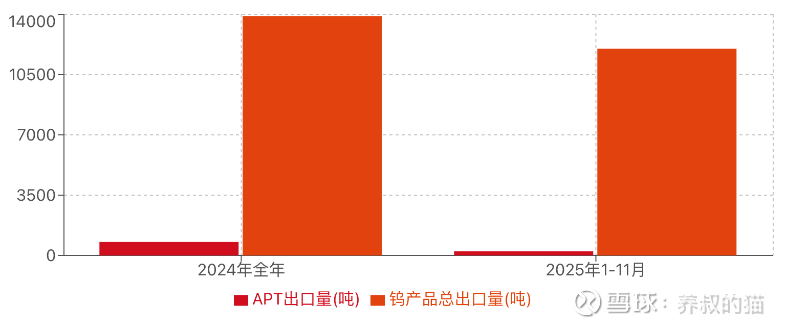 2025年2月4日,中国对钨、碲、铋、钼、铟实施出口管制,涵盖41个HS编码。出口管制实施后,中国钨APT出口量从2024年的782吨骤降70%至2025年前11个月的243吨。总出口从2024年13900吨降到2025年的12000吨,降幅-13.7%。