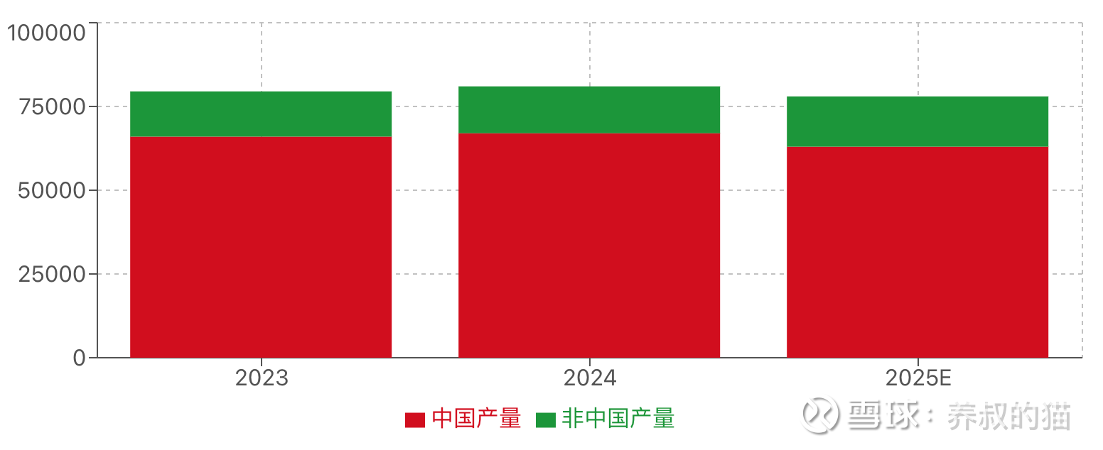 初级产量:全球78,000-82,000吨,中国63,000-66,000吨(配额收紧+品位下降制约),非中国15,000-16,000吨(越南/俄罗斯稳定,西方小增)。