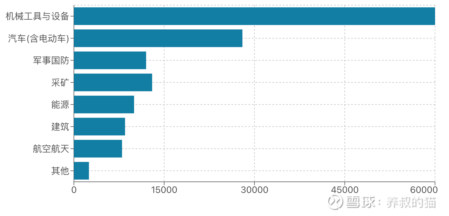 机械工具与设备42.5%(60,000吨);汽车(含电动车)19.7%(28,000吨);军事国防8.5%(12,000吨);采矿9.2%(13,000吨);能源7.1%(10,000吨);建筑6%(8,500吨);航空航天5.6%(8,000吨);其他1.8%(2,500吨)。
