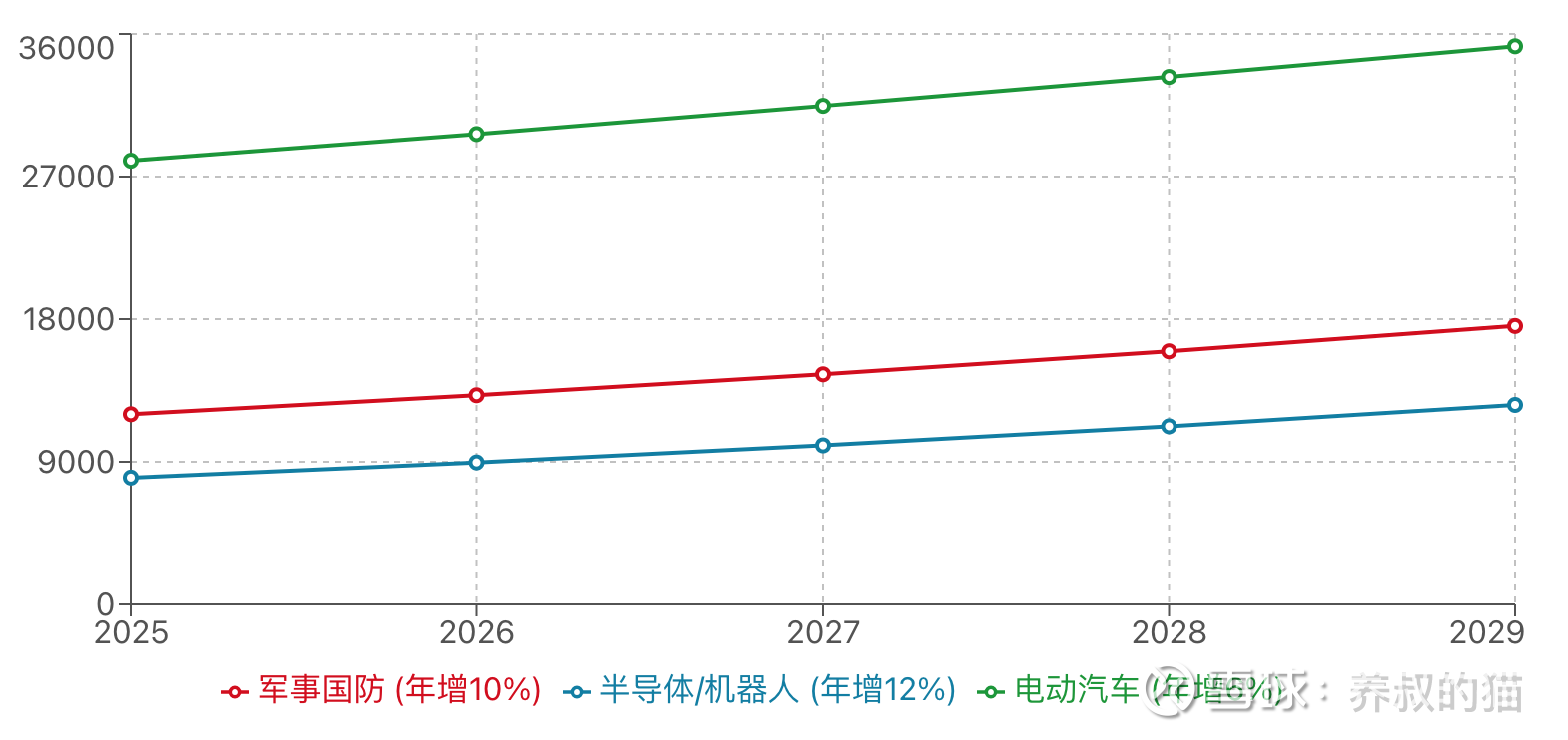 注:EV需求间接为主(每辆0.5-2kg),新兴电池技术潜在增量未全计入。半导体增长最快,国防刚性最强。