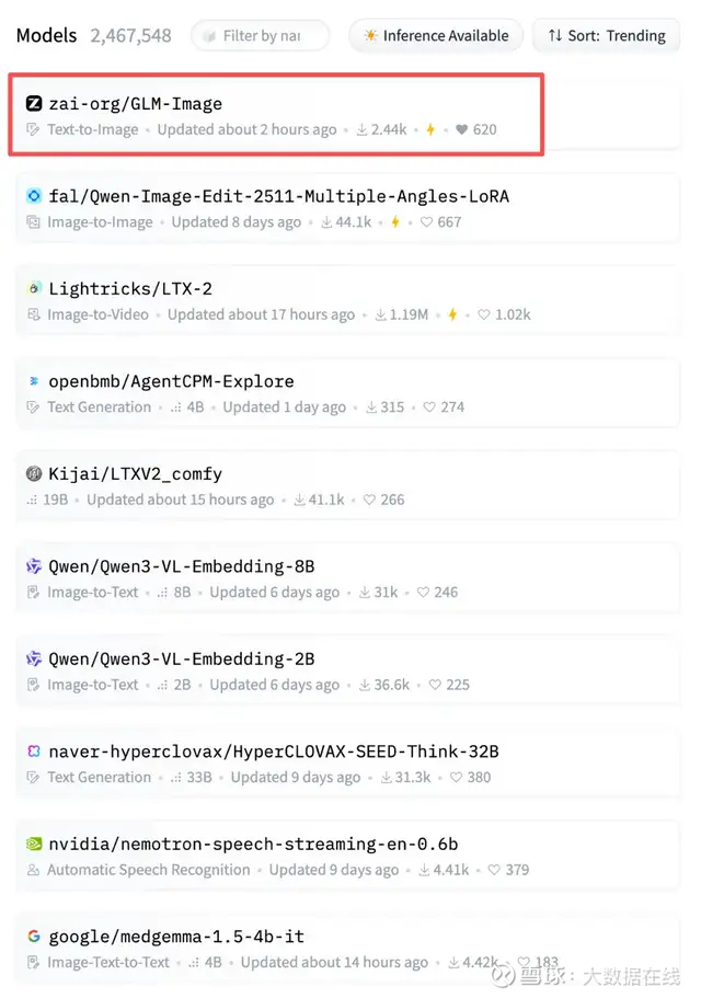 此外,GLM-Image在开源不到24小时就登顶全球知名AI开源社区Hugging Face Trending榜第一。Hugging Face是全球知名的开源AI模型与工具生态平台,堪称全球AI界的顶流。GLM-Image此次登顶,其模型SOTA性能、混合架构创新和训练过程引发了全球AI圈的广泛热议。