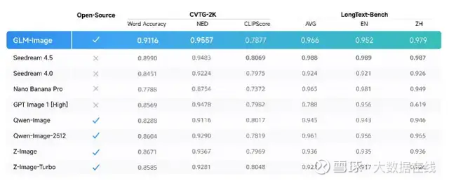 据悉,GLM-Image在CVTG-2K(复杂视觉文本生成)和LongText-Bench(长文本渲染)榜单获得开源第一。