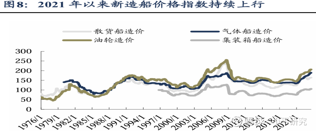 本轮船舶周期从2021年新造船订单翻倍为启动标志,上一轮以2003年订单翻倍为标志。新造船价格指数与订单同步。