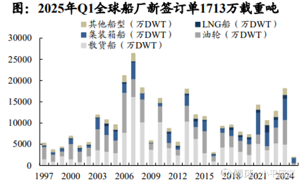 本轮周期:2021年订单翻倍为第一浪上涨(箱船大爆发+干散货小增加),2022年-2023年为调整,2024年小爆发为第二浪小上涨(箱船爆发+油轮小增加),2025年为大调整,预计2026-2027有第三浪最大的上涨,具体由油轮+干散货订单爆发所驱动。当然,也要可能再推迟到2028年。