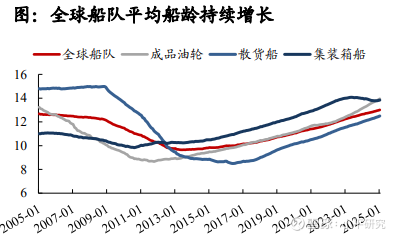 一是更新需求,取决于船龄,如下图。截至2024年末,按载重吨位计算,全球船队的平均船龄为13.0年,同