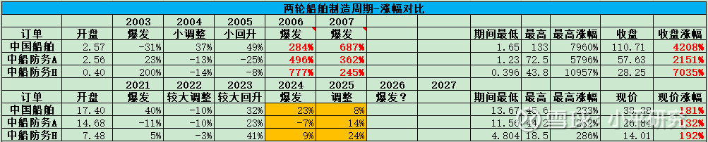 本轮周期,从2021年到2025年,现在累计涨幅,中国船舶181%、中船防务A 132%、中船防务H 192%,涨幅还非常小,当然原因是油轮和干散货订单还没有爆发。