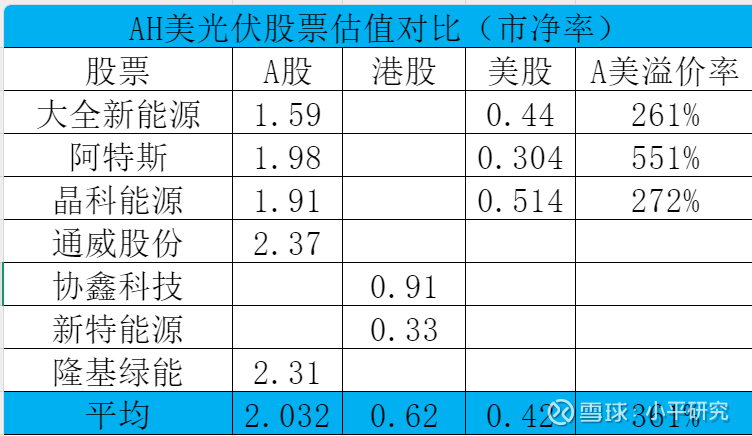 阿特斯在A股市净率1.98倍,美股0.304倍,A美溢价率551%;