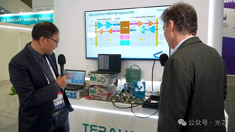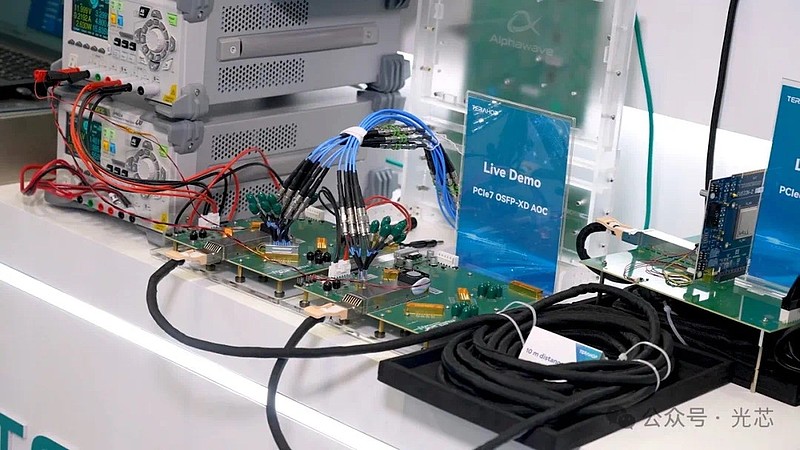 展示基于 PCIe Gen 6 的光连接,可实现 GPU 到 GPU、GPU 到内存、CPU 到内存、CPU 到存储等多种光连接,突破了铜缆仅在机架内连接的限制,连接距离可达 10 米。采用 LPO 技术结合 PCIe,制成低功耗收发器的有源光缆,在保证低功耗的同时实现长距离传输。