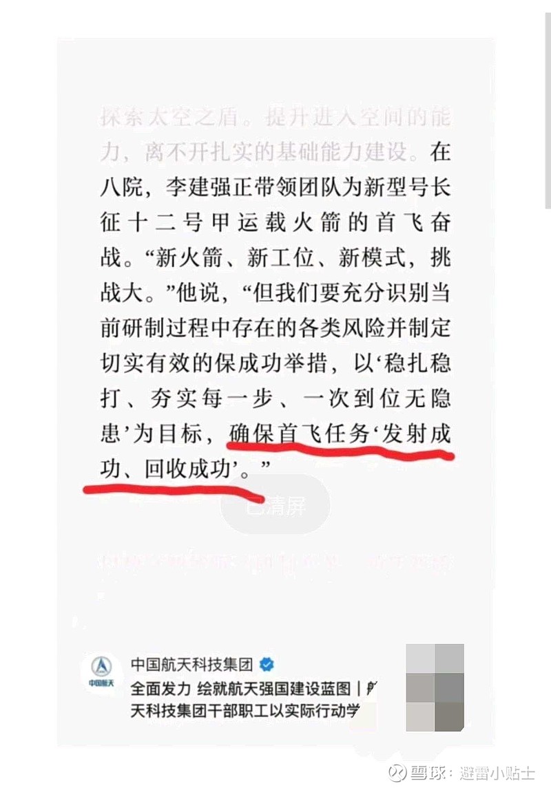 $航天机电(SH600151)$长征十二甲总工程师 明确表态 回收必须成功十二甲是航天八院(上海航天技术研究院)研制的可回收火箭,而航天机电是八院唯一上市平台。目前定于17号发射,如果实验成功,作为我国第一个成功回收的平台,开启商业航天新征程,值几个板?