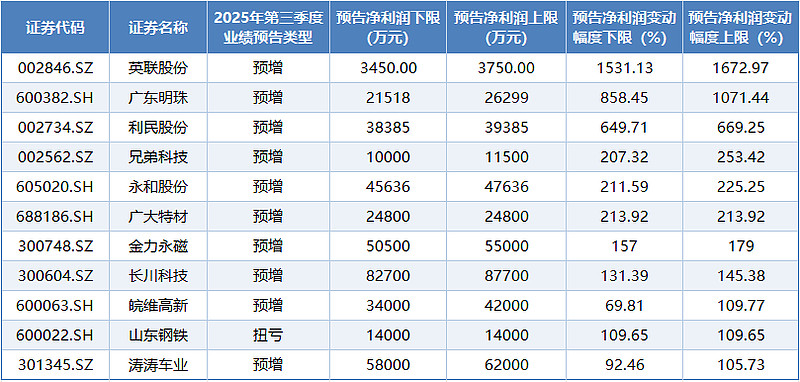 以预计净利润变动幅度上限来看,2家公司预计净利润变动幅度上限超10倍,3家公司预计超5倍,11家公司预计实现翻倍。其中,英联股份(002846.SZ)预计今年前三季度实现净利润3450万元至3750万元,同比增长1531.13%至1672.97%。