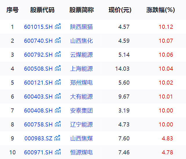 10月23日,煤炭股冲高,陕西黑猫(601015.SH)、山西焦化(600740.SH)、云煤能源(600792.SH)、上海能源(600508.SH)、郑州煤电(600121.SH)、大有能源(600403.SH)、安泰集团(600408.SH)、辽宁能源(600758.SH)等多股触及涨停。