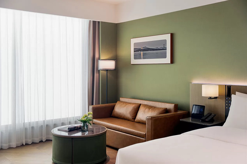围绕“憩于艺(Rest in Art)、弛于室(Relax in Room)、漫于城(Unwind in City)”三维打造产品,以现代框架融合复古精致的艺术质感。“憩于艺”体现在公区设本土艺术走廊与非遗空间,墙面陈列在地艺术家作品;“弛于室”聚焦客房体验,以艺术的草木绿为主色调,搭配复古皮革家具与木质地板,配备零压床、充满松弛感的客房空间、城市专属香薰与古典音乐构建五感体验;“漫于城”则以酒店为枢纽,连接本地文艺活动、游玩路线与美食地图,可预约私人导览服务。