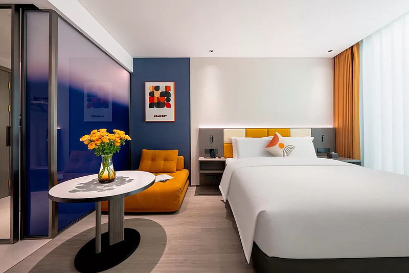 以“Set(各就各位)-Rested(舒适休憩)-Go(轻装启程)”为产品设计线索,构建适配年轻人的共享生活场域。空间注入东方美学,三秒识别动线的自助接待中心集成入住、自助行李寄存、轻负担早餐等功能,呼应“Set”的便捷需求;客房以零压床、“挺你”沙发、全域 Chill Vibe 背景音乐构建放松场景,艺术渐变玻璃隔断优化坪效,承接“Rested”的松弛诉求;独创全流程“抛物-减压”服务美学,从智能快速入住、赠送城市漫游指南,到离店行李邮寄与幸运曲奇,全程护航“躺平”体验,让客人自在“Go”往下一程。