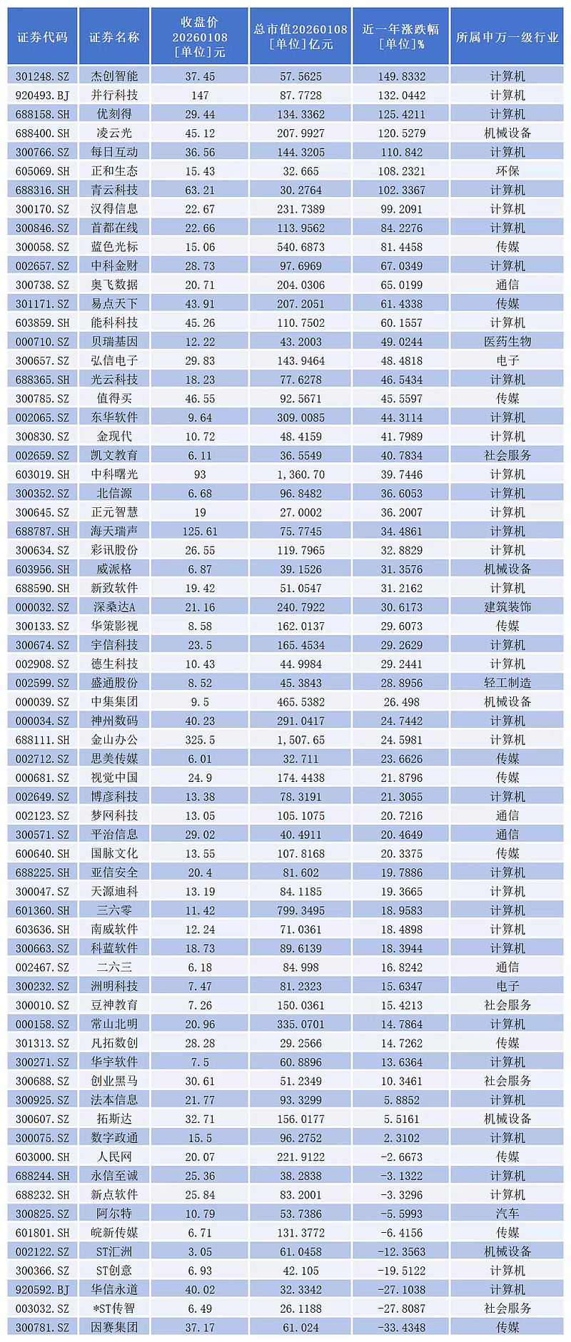 从二级市场表现看,截至1月8日收盘,近一年,已诞生杰创智能(301248.SZ)、并行科技(920493.BJ)、优刻得(688158.SH)、凌云光(688400.SH)、每日互动(300766.SZ)、正和生态(605069.SH)、青云科技(688316.SH)等7只翻倍股。
