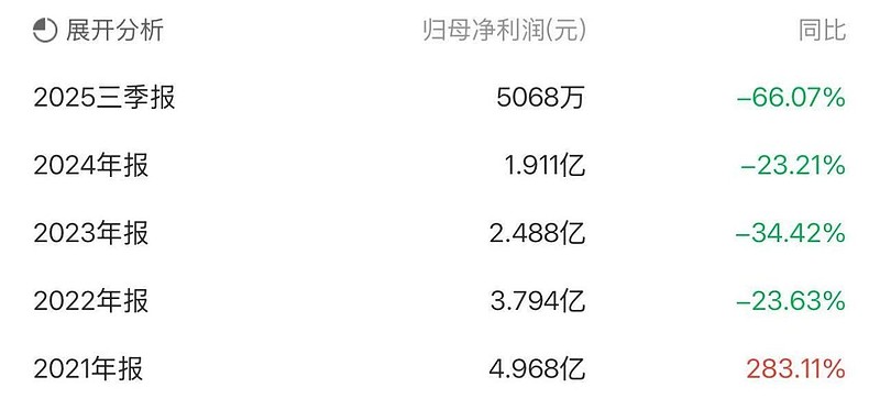 数据显示,镇洋发展业绩已连续下跌4年,净利润从2021年刚上市时的5亿元高峰,下跌至2025年三季度的0.51亿元,降幅达89.8%。