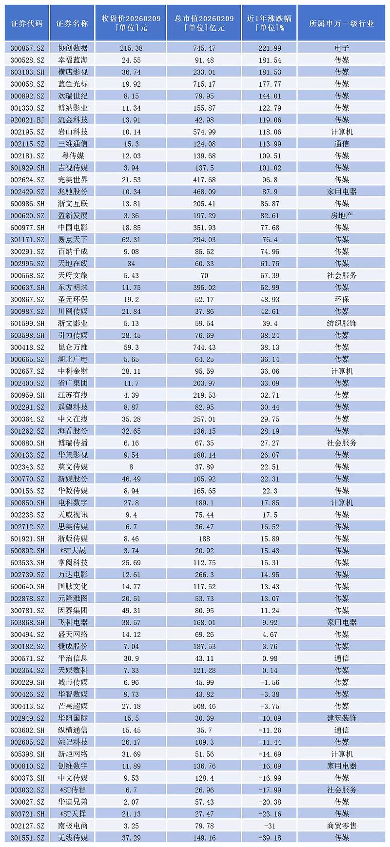 从二级市场表现看,近一年来,67家上市公司中,股价实现上涨的有53家。其中,21家涨幅超过50%。协创数据、幸福蓝海、横店影视、蓝色光标、欢瑞世纪、博纳影业、流金科技、岩山科技、三维通信、粤传媒、吉视传媒等11家公司近一年股价成功实现翻倍。