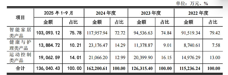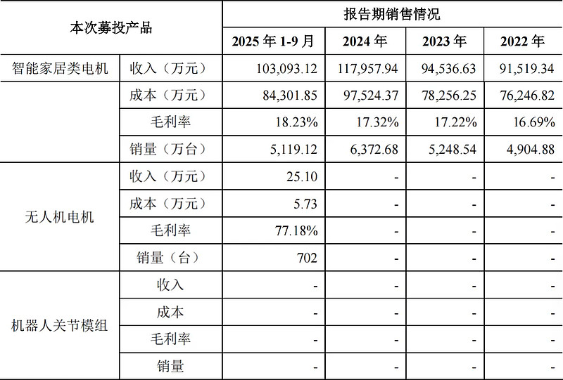 公告显示,本次募投智能家居类产品为现有成熟产品,2022年、2023年、2024年和2025年前三季度,分别实现91,519.34万元、94,536.63万元、117,957.94万元和103,093.12万元。无人机电机处于小批量试产供货阶段,实现收入25.10万元,机器人关节模组尚处于研发阶段,暂未实现收入。