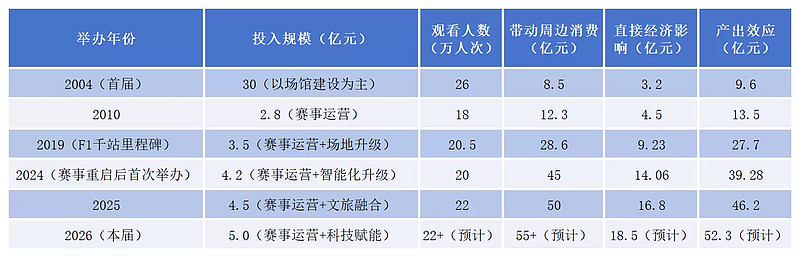 统计数据显示,F1中国大奖赛的经济拉动效应呈现逐年攀升的态势。2004年首届赛事带动周边消费仅8.5亿元,而到2025年这一数字已突破50亿元,21年间增长近5倍;直接经济影响从3.2亿元增长至16.8亿元,产出效应从9.6亿元增长至46.2亿元,彰显了顶级赛事的强大商业价值。