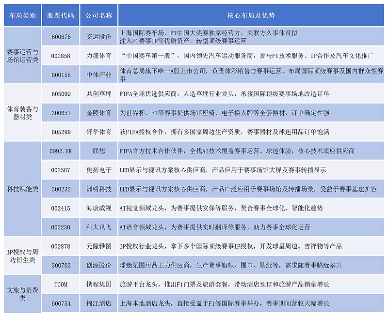 力盛体育(002858)作为“中国赛车第一股”,是国内领先的汽车运动服务商,通过参与F1等赛事的技术服务、IP合作、汽车文化推广等方式获益,赛事的举办将直接带动其赛车培训、周边产品等业务的增长。