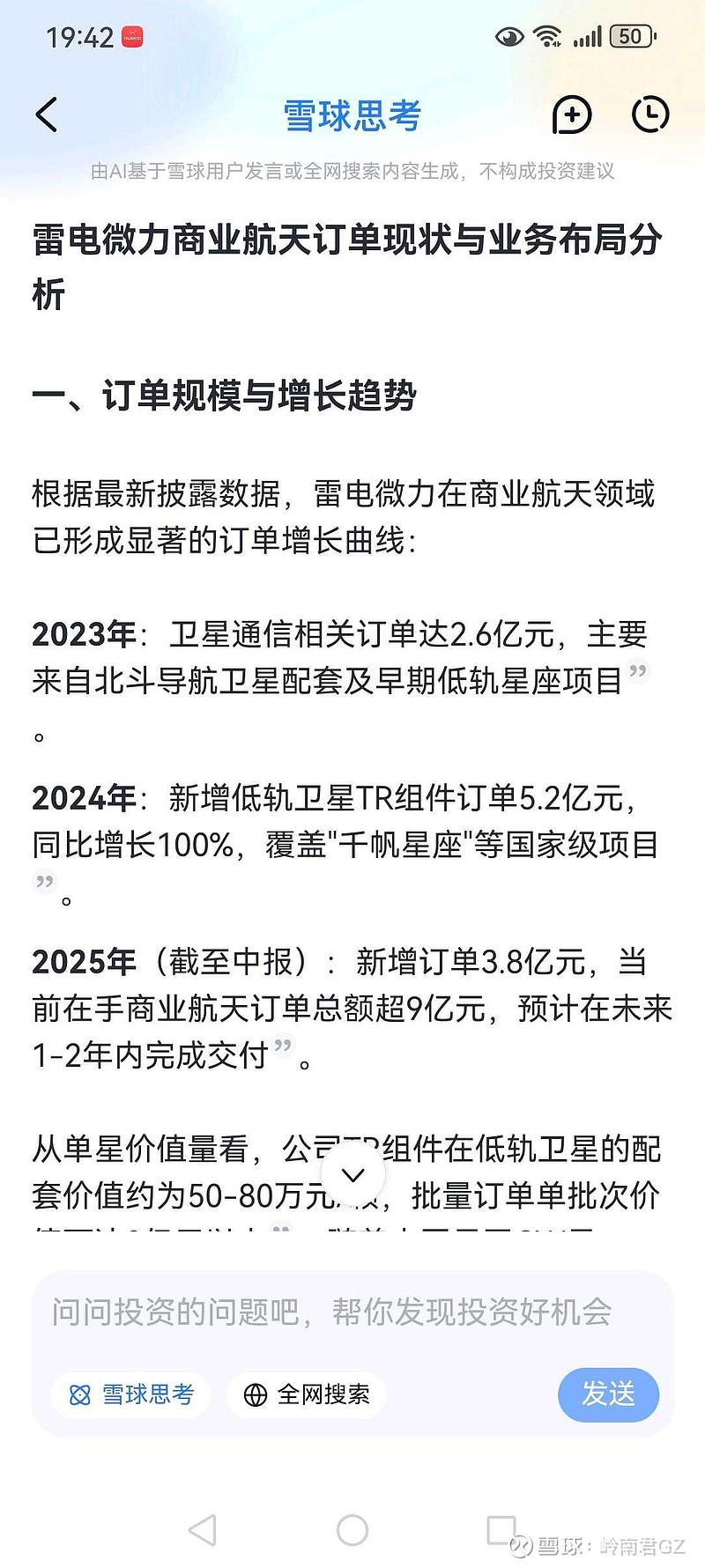 现在的主业就是商业航天,它的大部分订单就是这个方向。如果未来每年大批量低轨卫星上天,雷电的业绩将井喷式几倍式的增长。