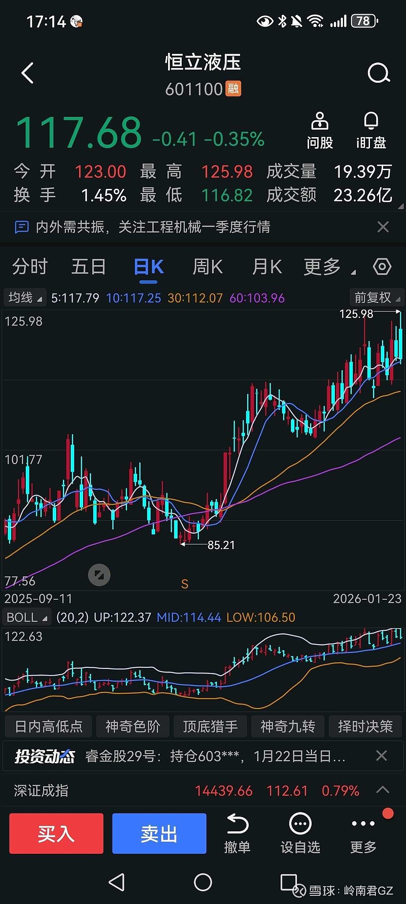 恒立液压一直在窄幅震荡,超过一个月了,在流动性充足的市场中,这样的走势不太正常,如果是熊市当中这样的走势风险很大,目前的指标全部背离了,但目前是牛市,主力敢这么去玩。沿着布林带中轨走了一个多月,这样的走势从来没有见过。这样的位置需要洗这么久吗?上方离历史新高都是一步之遥了,应该几乎没有套牢盘了吧近3天的走势也另人玩味,今天的走势你认为是什么情况?或许下周就将迎来变化了,机器人对比其他板块走的还是太差了。