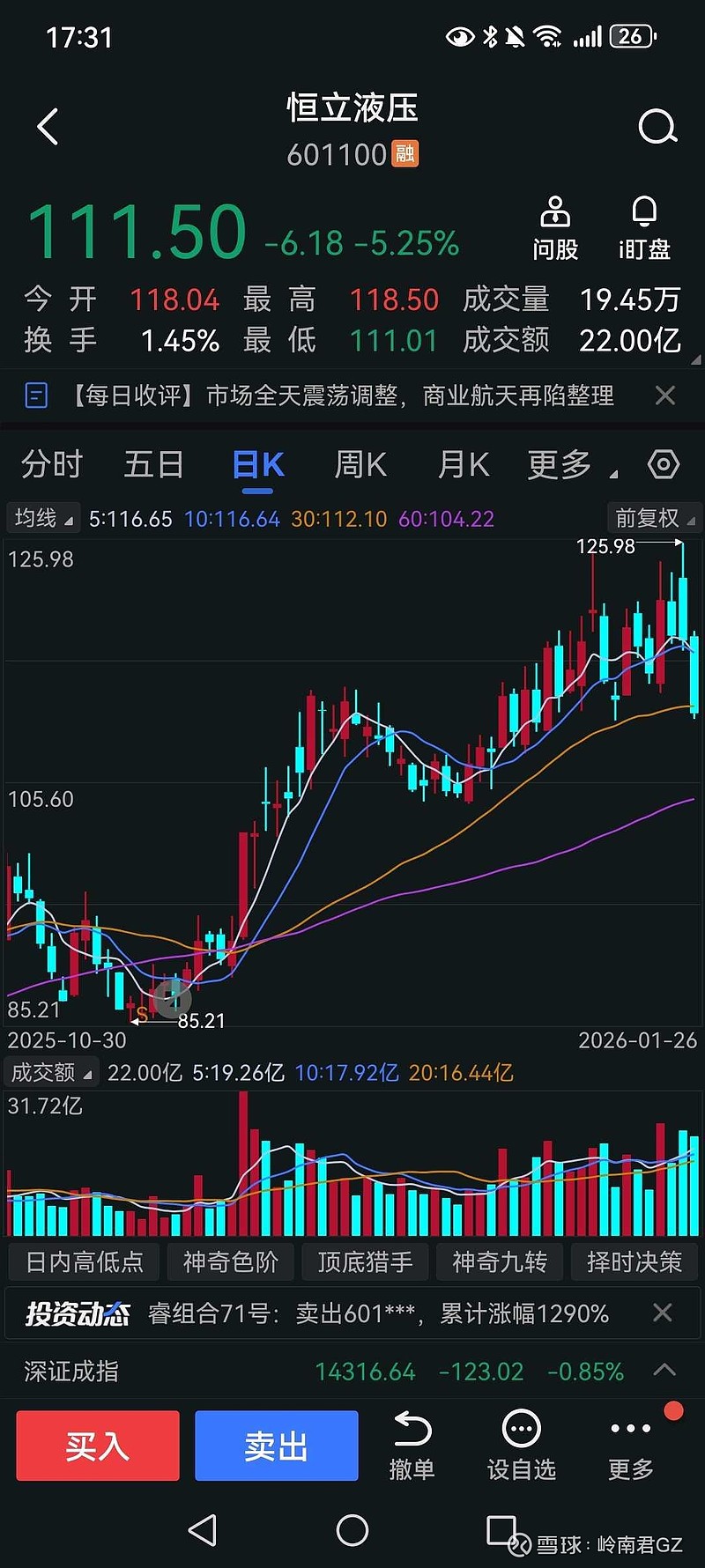 恒立液压这个大阴线还不至于是断头杀。只是震荡的时间继续延长,目前马上要过年了,可能是年后的事情了。近期我写了恒立液压,我说了马上要变盘了,未必是向上的。对绝大多数人来说,120多就应该卖,最后那个顶部的高点的利润不是那么好拿的。