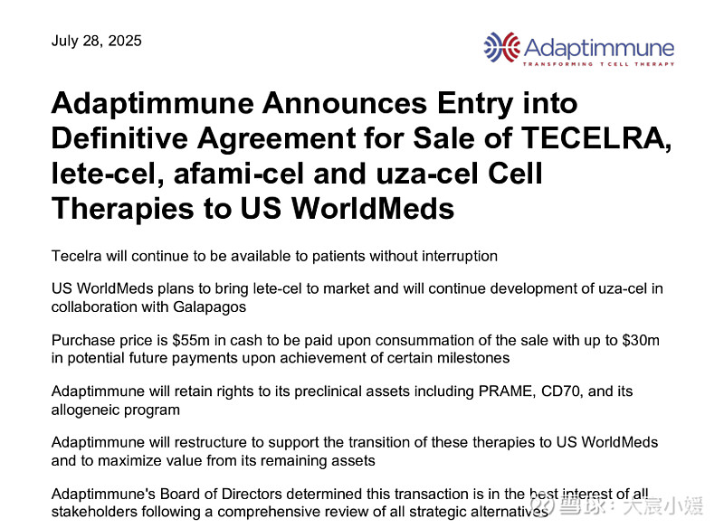 2025年07月29日 10:10 上海2025年7月28日,就在全球首款TCR-T细胞疗法批准近一年之际(全球首个TCR-T细胞疗法获批上市),其开发公司Adaptimmune Therapeutics宣布了一项重大交易。