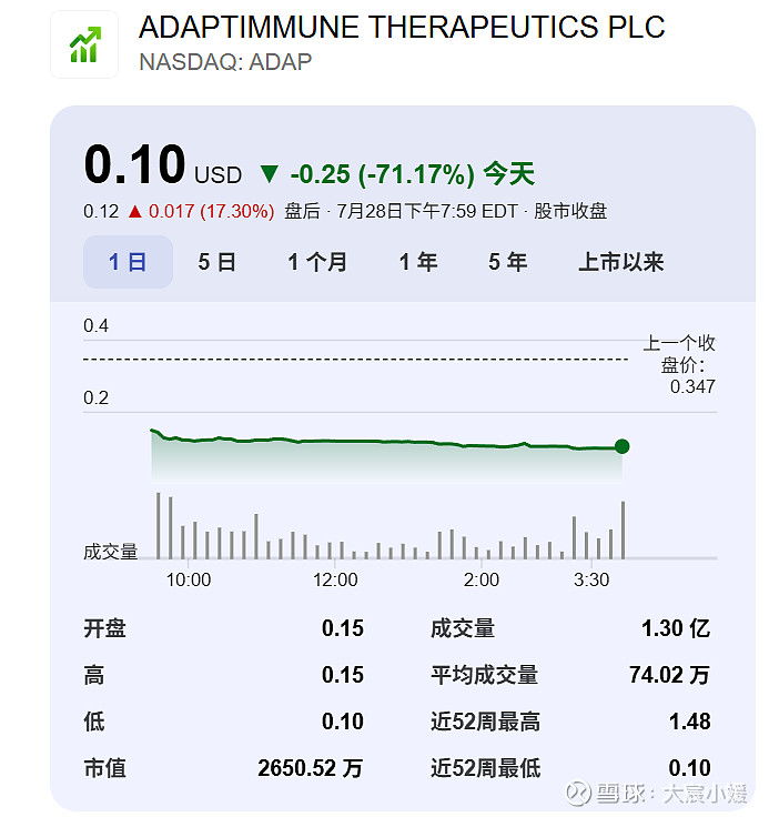 继续此消息推动,Adaptimmune Therapeutics股价暴跌71%,市值仅剩2650万美金。