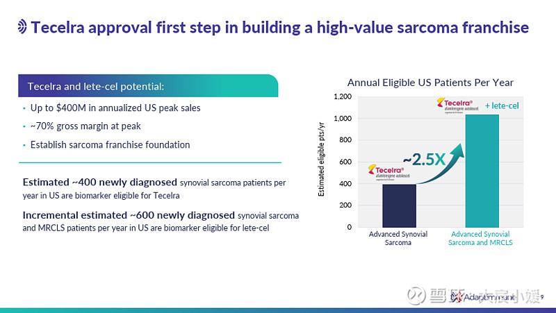TECELRA单价高达72.7万美金(全球首个TCR-T细胞疗法定价72.7万美金,销售峰值预计为4亿美金),此前预计其销售峰值峰值将达到4亿美金。上市以来,TECELRA的销售仍然在艰难爬升。