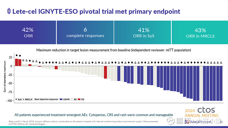 虽然处境艰难,但是Adaptimmune仍然相信其第二款靶向NYESO的TCR-T细胞疗法Late-cel,预计将在2026年上市获批,用于滑膜肉瘤的治疗,有可能改善公司财务环境。