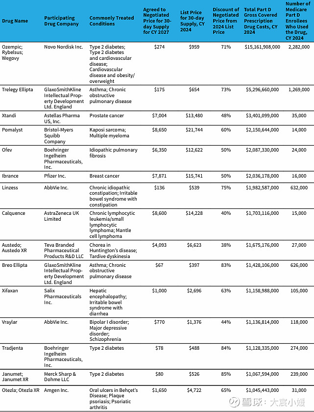 本轮谈判共15款药物入选,包括Ozempic/Rybelsus/Wegovy(司美格鲁肽)、Trelegy Ellipta(糠酸氟替卡松+乌美溴铵+维兰特罗)、Xtandi(恩扎卢胺)、Pomalyst(泊马度胺)、Ofev(尼达尼布)、Ibrance(哌柏西利)、Linzess(利那洛肽)、Calquence(阿可替尼)、Austedo/Austedo XR(氘代丁苯那嗪)、Breo Ellipta(糠酸氟替卡松+维兰特罗)、Xifaxan(利福昔明)、Vraylar(卡利拉嗪)、Tradjenta(利格列汀)、Janumet/Janumet XR(西格列汀+二甲双胍)和Otezla/Otezla XR(阿普米司特),涵盖癌症、糖尿病、哮喘及其他慢性疾病,代表了医疗保险D部分(可患者自我管理的处方药)开支最高的部分。