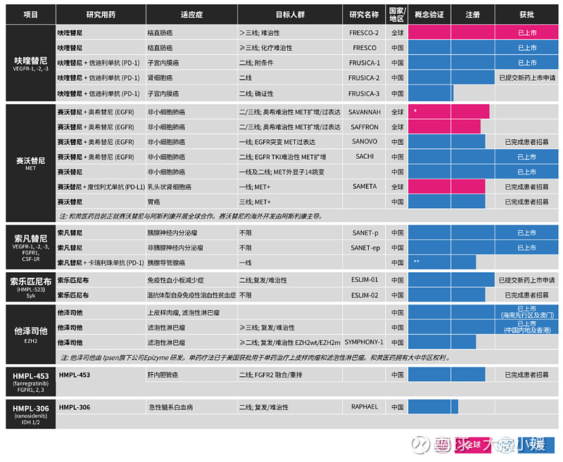 在全力推进国际化的同时,和黄医药也始终将本土视为发展的战略根基,持续巩固其在本土市场的产品渗透与品牌影响力,形成了“国际化开拓”与“本土深耕”双引擎驱动的良性发展格局。 成长至今日,和黄医药的商业化已经不再是呋喹替尼独挑大梁。在过去20年的持续创新中,随着赛沃替尼、索凡替尼相继获批,与呋喹替尼共同构成“替尼三将”的商业化基本盘。今年3月,全球首个EZH2抑制剂,和黄医药引进的他泽司他在国内获批上市,用于治疗EZH2突变阳性且既往接受过至少两种系统性治疗的复发或难治性滤泡性淋巴瘤成人患者。另一血液领域产品索乐匹尼布的中国新药上市申请也正在审批中。医药魔方NextPharma数据库显示,该药的开发进度处于中国第一,全球第二。根据CDE官网于11月21日发布的信息,和黄医药的酒石酸凡瑞格拉替尼(HMPL-453)拟纳入优先审批,用于肝内胆管癌,预示着上市申请提交在即 。