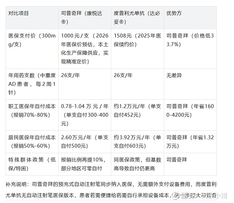 补充说明:司普奇拜的预充式自动注射笔同步纳入医保,无需额外支付设备费用,而度普利尤单抗无自动注射笔医保版本,患者若需便捷给药需自行承担设备成本,进一步拉大司普奇拜的成本优势。值得注意的是,司普奇拜纳入医保前单价已降至大约1000元左右,医保落地后以1000元/支的支付价进一步降低负担,较此前进口同类药物5000多元/支的价格实现大幅减负。