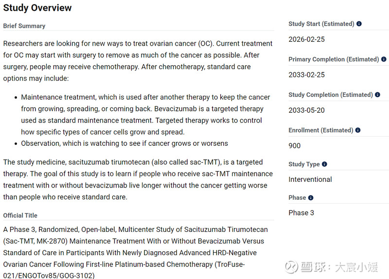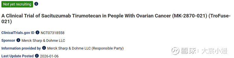 2026年1月6日,默沙东在Clinicaltrials.gov网站上注册了Trop2 ADC新药芦康沙妥珠单抗(MK-2870、SKB264)联合或部联合贝伐珠单抗治疗一线铂类化疗治疗后进展的HRD-卵巢癌的三期临床试验,这也是默沙东围绕芦康沙妥珠单抗开展的第16项全球三期临床试验。