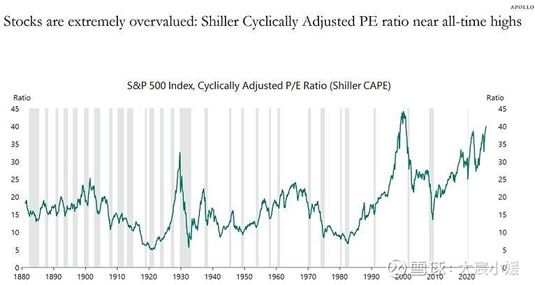 阿波罗的数据显示,当前约 39 的读数比历史平均水平高出了一倍多。这意味着未来 10 年的预期年化回报率可能会非常低,甚