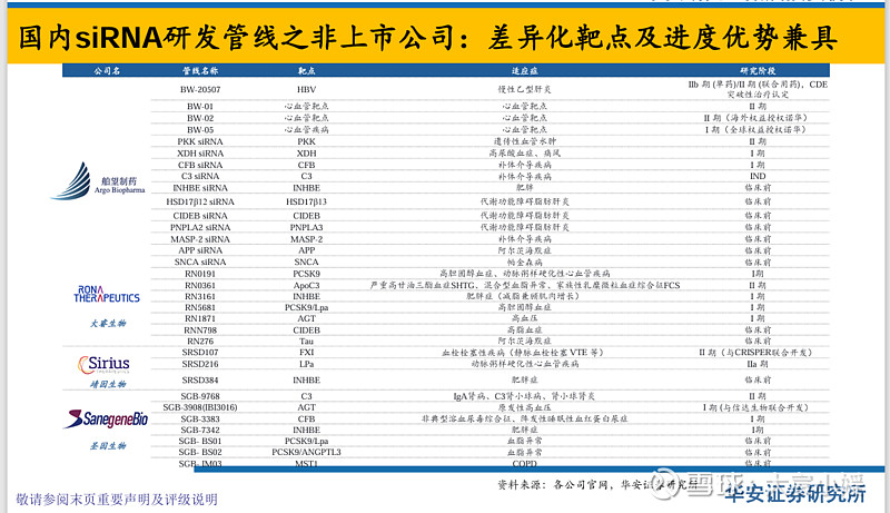 ◼技术迭代应用拓展:递送技术方面,逐步实现从肝靶向到跨脑递送、肺靶向等肝外靶向的技术突破;适应症方面 ,从罕见疾病及心血管疾病,到减重等重大代谢领域以及CNS甚至肿瘤领域的延伸。 ◼药物靶点布局:成熟靶点方面,继Inclisiran(PCSK9前蛋白转化酶枯草溶菌素9)在2020年首次获批,开启 siRNA在心血管领域的应用后,ApoC3(载脂蛋白C3)、Lpa(脂蛋白a)、ANGPTL3(血管生成素样3)等调脂 治疗相关靶点成为药企在研“标配”,AGT(血管紧张素原)、FXI(凝血因子XI)深化高血压、血栓疾病应用。 新兴靶点方面,INHBE(抑制素亚基βE)、ALK7在肥胖初步数据披露、PNPLA3等在MASH的发展、C3等在补 体相关疾病、IgA肾病管线增加,持续扩大siRNA的应用范围及前景。