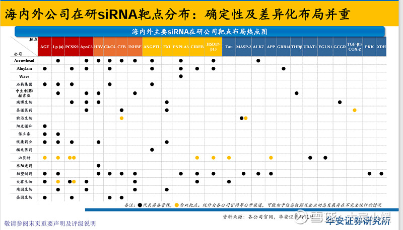 技术突破叠加适应症拓展,海内外产业逻辑共振,多点开花 主要观点:技术及适应症限制突破,海外产品进入商业化验证阶段,海内外产业趋势共振,国内布局公司有望获得 资本市场受益,进而加速技术更新及管线推进,持续关注小核酸领域投资机会。