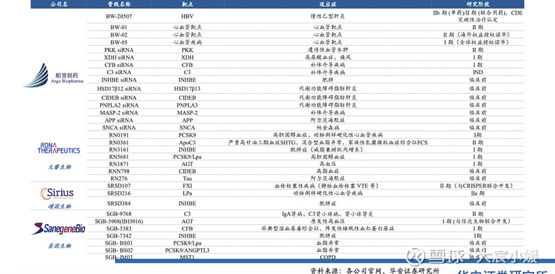 部分创新Biotech小核酸管线开源证券在研报中指出:在siRNA药物领域,中国企业已经逐步突破被海外垄断的核心底层技术,并完成对MNC的授权,凭借日益精进的制药能力,中国企业有望在siRNA药物上进一步突破,将更多中国原创的管线推向全球市场,成为BD新热点。不仅是在对外授权中获得MNC的青睐,在小核酸药物拓展最快的治疗高血脂、慢性乙肝领域,国内已有多款产品进入临床Ⅲ期。包括维亚臻生物的siRNA药物VSA-003通过LDLR 非依赖性及依赖性双重降脂机制,有效降低HoFH患者LDL-C水平;瑞博生物用于治疗非动脉炎性前部缺血性视神经病变RBD1007,以及浩博医药针对慢性乙型肝炎临床治愈的非偶联型的ASO药物AHB-137。随着国产力量“深入腹地”,预示着不久的未来,全球重磅药物的竞争舞台上,将出现更多中国原创的身影。TONACEA