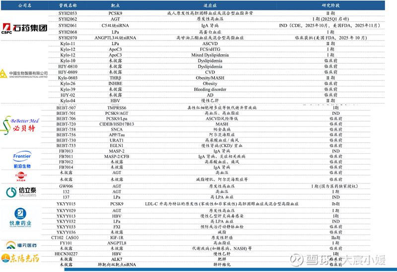 除了一批锐意进取的Biotech持续发力,国内传统药企也积极投身这股“现代制药的第三波浪潮”中。最近,中国生物制药就甩出了一记大手笔:花12亿元,收购赫吉亚生物。算上之前对圣因生物的投资,这已经是中国生物制药在小核酸赛道布下的又一枚关键棋子。赫吉亚手里有几个“硬核”技术平台:1)MVIP肝靶向平台:全球首个经过临床验证、能实现“一年只用打一针”的siRNA递送平台,而且有美国专利,摆脱了海外技术依赖;2)双链偶联平台(DDP):能同时递送两个靶点的siRNA,实现1+1>2的协同治疗效果,想象空间很大;3)神经递送平台(NSDP):布局更前沿,瞄准肝以外的靶点,比如大脑和神经系统疾病,预计2026年就有产品进临床。产品管线方面,赫吉亚有4个已经进入临床,其中最亮眼的是靶向Lp(a)的Kylo-11。这是全球首个在临床中显示“一年一针”就能大幅降低Lp(a)的候选药物,有成为同类最优(BIC)的潜力,目前在中美两地开展II期临床。临床前还有超过20个项目在准备,包括减重(INHBE)、阿尔茨海默病(APP)等这些大热靶点。中国生物制药在公告中指出,此次前瞻性战略收购,将加速集团在慢病领域的创新布局和临床推进,引领新一代创新疗法,惠及全球患者。换而言之,中国生物制药看中的,不仅仅是几款药,更是切入心脑血管等巨大慢病市场的“下一代技术”,相当于在小核酸产业全面爆发前,通过收购精准卡位,用12亿锁定了一张未来可能很贵的“入场券”。除了中国生物制药,包括信立泰、信达生物、齐鲁制药、华东医药等在内的慢性病传统成熟药企,也均通过引进或联合开发加速布局,如齐鲁制药以超7亿元引进瑞博生物PCSK9管线。此外,正大天晴、恒瑞医药、石药集团等头部药企自建技术平台,推动国产siRNA管线进入临床阶段。