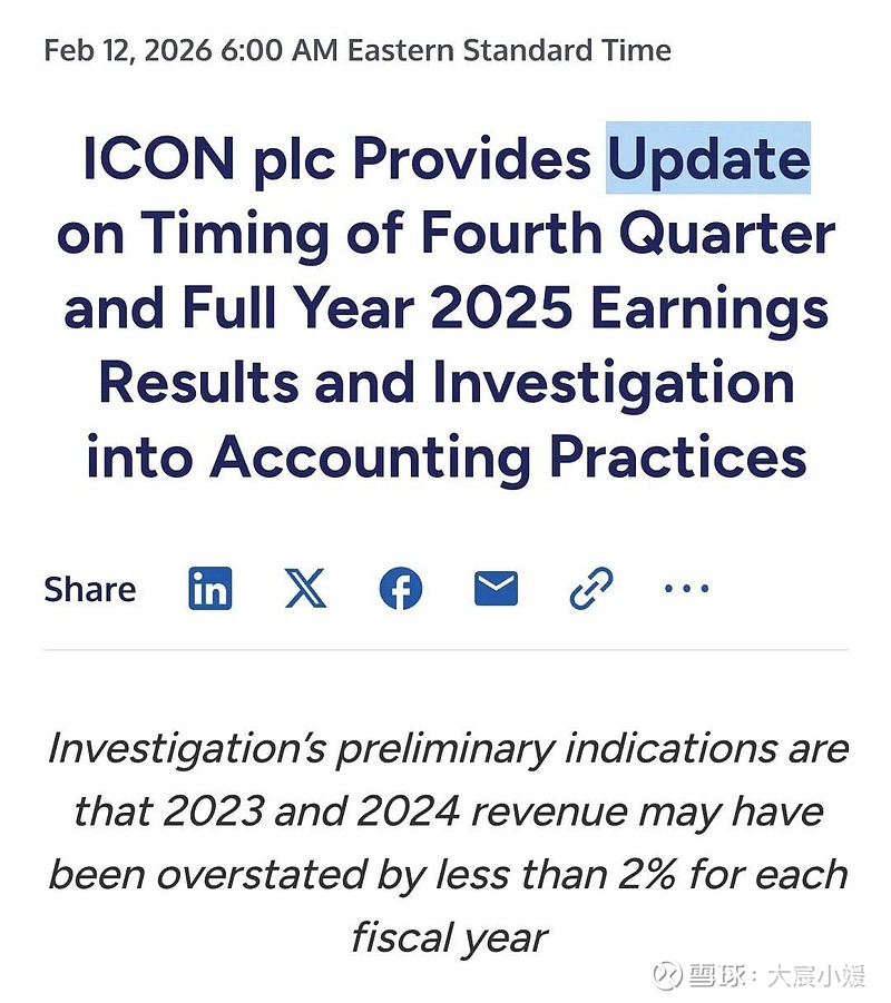 由于调查正在进行,ICON宣布将推迟发布2025年第四季度及全年财报,预计最迟于2026年4月30日公布。同时,公司已撤回此前发布的2025年全年财务指引。
